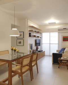 O importante aqui é respeitar as suas dimensões e escolher um modelo de lustre menor, que esteja condizente com as dimensões da sala para equilibrar a decoração.