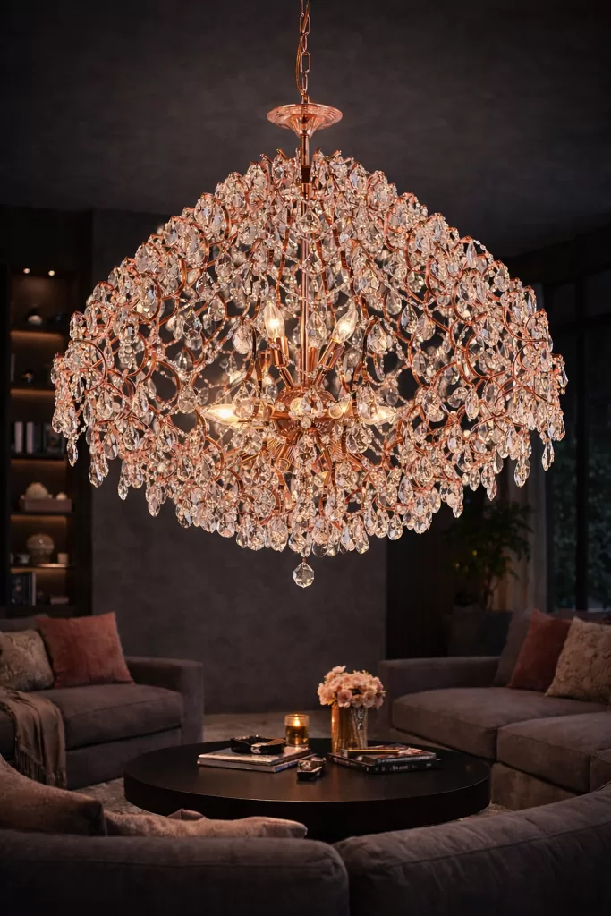 Os cristais ampliam o brilho e a sensação de amplitude, enquanto a cor rosê contribui para uma atmosfera acolhedora. Aproveite as condições especiais da Black Friday para investir em uma peça premium, que valoriza tanto projetos residenciais quanto comerciais.