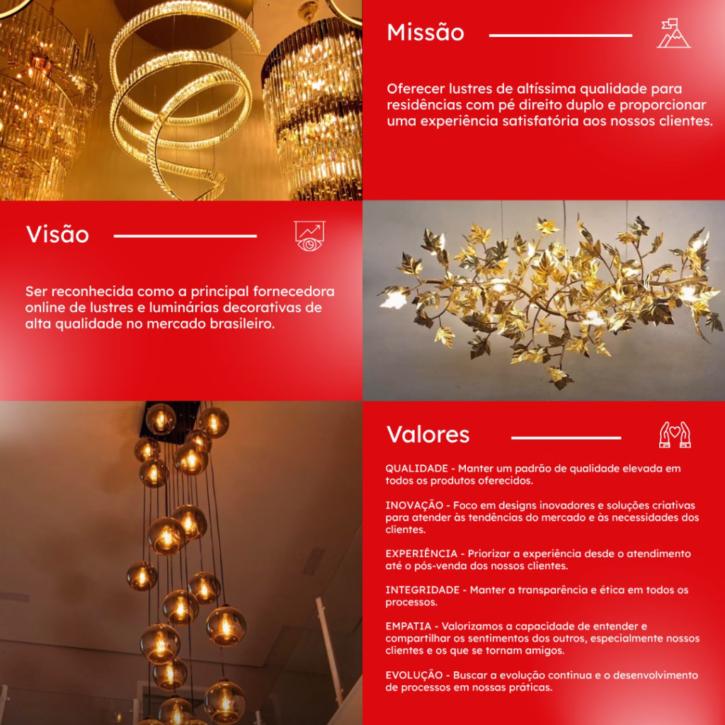 Com mais de 10 anos de experiência no ramo, estamos sempre nos desafiando para entregar o inesperado aos nossos clientes. Seja em qualidade, estilo ou elegância, queremos propor uma experiência única para nossos clientes quando o assunto é lustres. E disso nós entendemos.